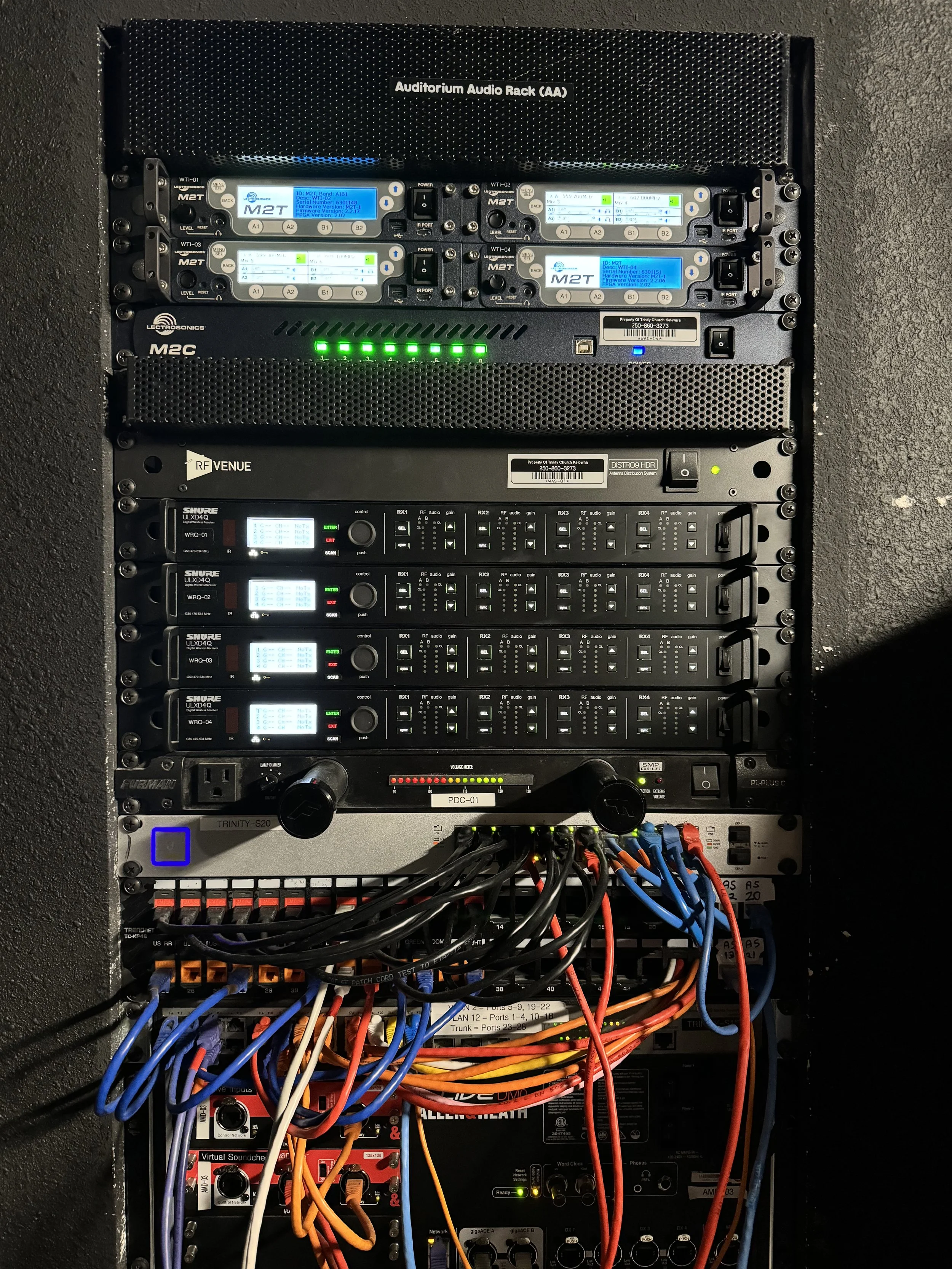 RF rack back stage at Trinity Baptist Church featuring Lectrosonics IEM, Shure Mics, and RF Venue antenna distribution.